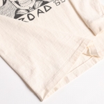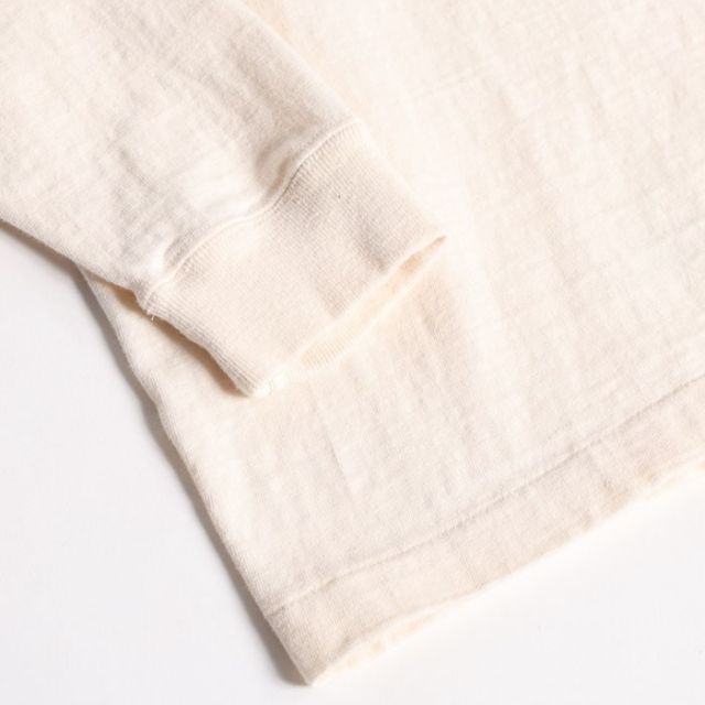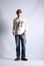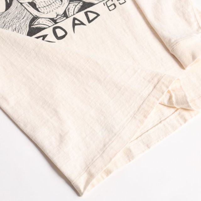 大人気アイテムとなった丸胴シリーズから待望の新作プリントLONG TEEがリリース。原点回帰でもある「古着」の表情をよりストレート且つ豊かに盛り込んで製作する一枚は16番単糸を吊り編み機でゆっくりと編み上げた丸胴仕上げ。旧い紡績技術により太い糸と細い糸が交ざり合うことで生まれる横段はこのシリーズならでは。身丈裾の縫製仕様に当時と同じ「天地縫い」を採用してシングルステッチ仕様に。ネック部のトリプルのバインディング仕上げやショルダーステッチなどの型崩れ防止が必要となる部位には従来通りの強度ある縫製法を使い分けて採用するという、拘りを満載した極上の一枚です。若干の斜行が特徴的なボディーは柔らかな着用感で気持ちゆったりとした着心地を提供。当時のVINTAGE TEEがそうであるように、プリントは敢えて前面のみとしています。袖リブも程好く短めに仕上げました。