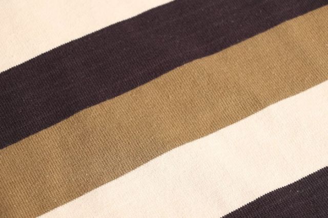10番糸引き揃えで製作する変則ボーダー。引き揃え手法で生地を編み立てながら、途中で編み方を変更して柄を出していくのには非常に高い技術力が必要とされます。良質な素材と技術力とに裏打ちされた本物ならではの質感に3色ボーダーを取り入れたシンプルで新鮮な新しいボーダーです。