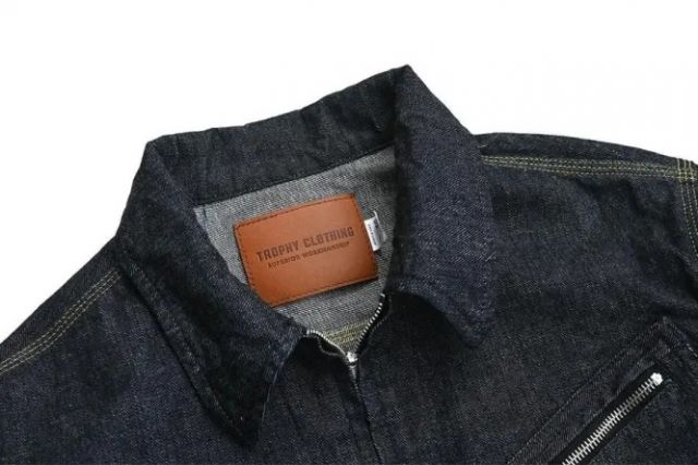 フロントには TROPHY 刻印入りの扇形ジッパー、鉄製ボタンを採用し、縫製にはイエロー×ブラックの綿糸を使用。細部までこだわりを感じられる仕上がりです。