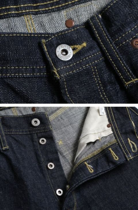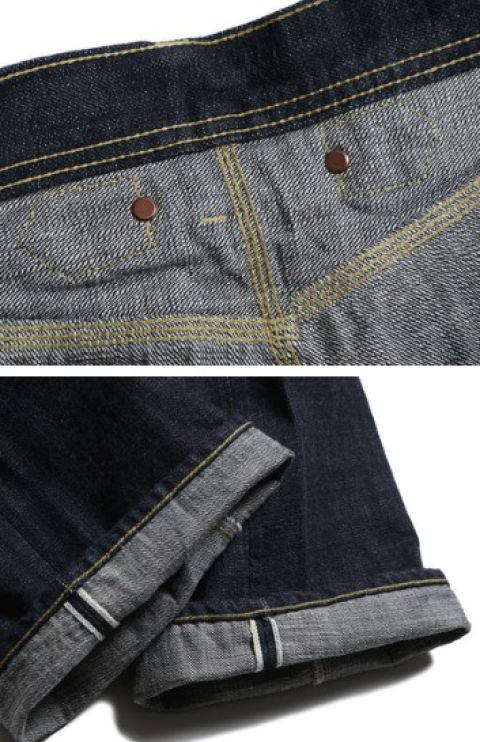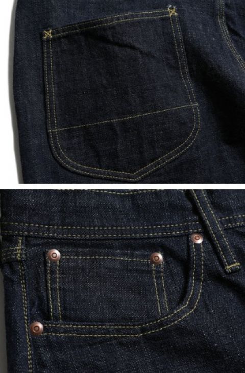 全てイエローステッチ、鉄ボタン、打ち抜きリベットを使用。