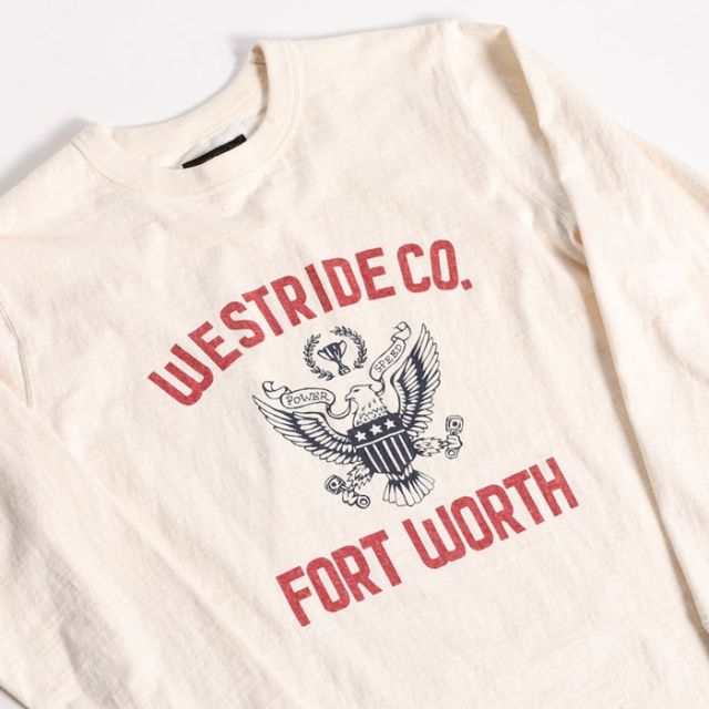 VINTAGEのクラシカルなバイカーTEEを彷彿させるこちらにはトロフィーとイーグルが描かれる。FORT WORTHのレース会場で販売されていたメモリアルTEEという仮想をイメージモチーフとした威風堂々の新作グラフィック。