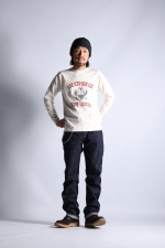 大人気アイテムとなった丸胴シリーズから待望の新作プリントLONG TEEがリリース。原点回帰でもある「古着」の表情をよりストレート且つ豊かに盛り込んで製作する一枚は16番単糸を吊り編み機でゆっくりと編み上げた丸胴仕上げ。旧い紡績技術により太い糸と細い糸が交ざり合うことで生まれる横段はこのシリーズならでは。身丈裾の縫製仕様に当時と同じ「天地縫い」を採用してシングルステッチ仕様に。ネック部のトリプルのバインディング仕上げやショルダーステッチなどの型崩れ防止が必要となる部位には従来通りの強度ある縫製法を使い分けて採用するという、拘りを満載した極上の一枚です。若干の斜行が特徴的なボディーは柔らかな着用感で気持ちゆったりとした着心地を提供。当時のVINTAGE TEEがそうであるように、プリントは敢えて前面のみとしています。袖リブも程好く短めに仕上げました。