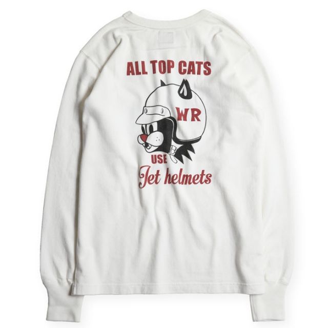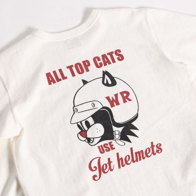 POPなグラフィックが目を惹くKNUCKLE氏による描き下ろし。フロントは実在OILメーカーの旧いアドバタイズをモチーフに人気キャラのサンダーキャットをフューチャー。バックにはBELL HELMETのHORSEをCATへ描き換え、ヘルメットを着用。プリントの前後でストーリーが繋がる設定となり、「出来るCATS(人たち)はヘルメットを被る」の文言でシーズンテーマを示唆する。