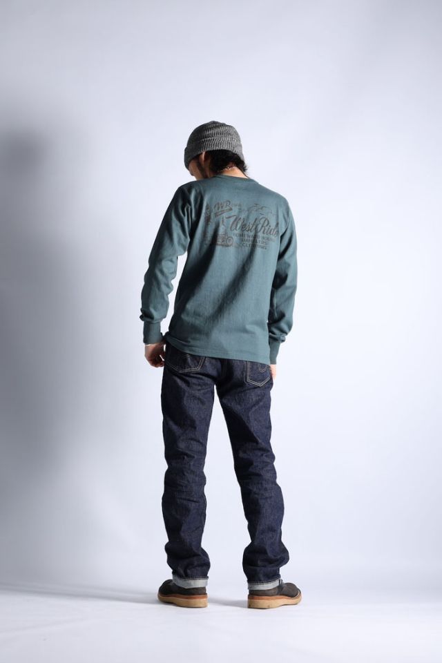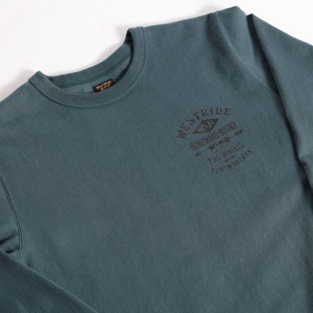 縫製:WESTRIDEのオリジナルL/S TEEは、丸胴の吊り機で編み立てる→サイドを割ってダブルシームで縫製→内側サイドの縫い代をカット→ネックはトリプルバインダー。と非常に手間のかかる仕上げとなっている。この工程により、丸胴に見られるヨジレなどの型崩れもなく、肌触りも良好となる。製品としての安定した品質を実現している。8番の単糸ではなく、16番双糸を使用することで生地に取り込むことのできる空気の層を増し、着用感をより高いものにしている。肌着としての側面も持つTEE類だけに、プリント柄だけでなく、品質そのものに拘って生産しています。