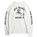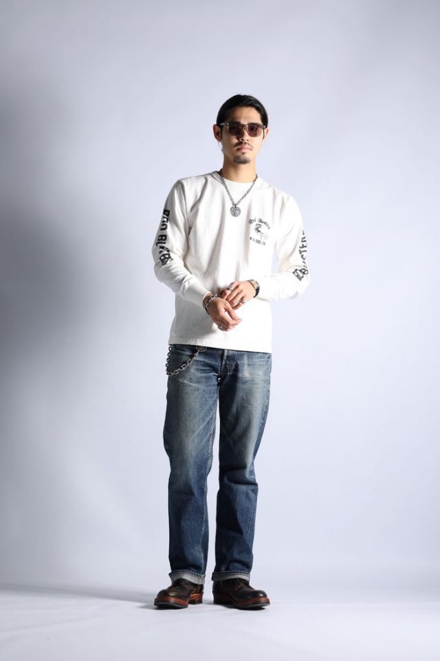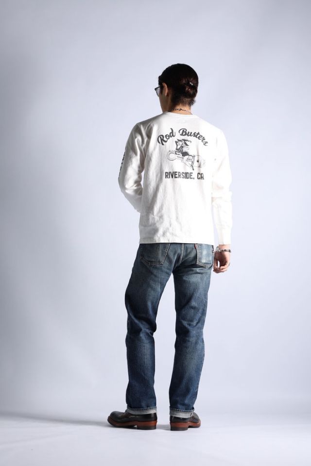 縫製:WESTRIDEのオリジナルL/S TEEは、丸胴の吊り機で編み立てる→サイドを割ってダブルシームで縫製→内側サイドの縫い代をカット→ネックはトリプルバインダー。と非常に手間のかかる仕上げとなっている。この工程により、丸胴に見られるヨジレなどの型崩れもなく、肌触りも良好となる。製品としての安定した品質を実現している。8番の単糸ではなく、16番双糸を使用することで生地に取り込むことのできる空気の層を増し、着用感をより高いものにしている。肌着としての側面も持つTEE類だけに、プリント柄だけでなく、品質そのものに拘って生産しています。