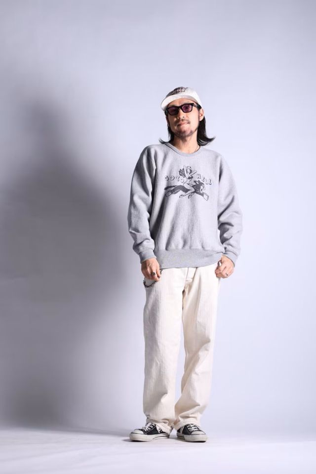 24FWでの一新から、既に多くのファンから愛され「ウエストライドのH/Wスウェット」として定着した感のある自信作。表側から順に14番/20番/7番糸を使用した3層のオリジナル生地は、丈夫で着心地も良く保温性にも優れている。また、経年変化による風合いも抜群。60’Sの銘品RWをモチーフとして、シームレス・ショルダーなどの古き良き前時代的ディテールを盛り込んで製作。カラーはオリジナルに極近しい色味で仕上げた杢GRAYとカレッジ物のイメージを再現するNAVYの2色。共にスタイルやデザインと掛け合わさり新鮮な印象を与える色味です。