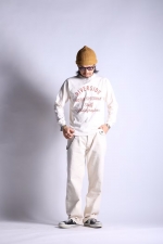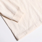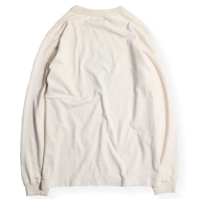丸胴シリーズからリリースするプリントLONG TEE。原点回帰でもある「古着」の表情をよりストレート且つ豊かに盛り込んで製作する一枚は16番単糸を吊り編み機でゆっくりと編み上げた丸胴仕上げ。旧い紡績技術により太い糸と細い糸が交ざり合うことで生まれる横段はこのシリーズならでは。身丈裾の縫製仕様に当時と同じ「天地縫い」を採用してシングルステッチ仕様に。ネック部のトリプルのバインディング仕上げやショルダーステッチなどの型崩れ防止が必要となる部位には従来通りの強度ある縫製法を使い分けて採用するという、拘りを満載した極上の一枚です。若干の斜行が特徴的なボディーは柔らかな着用感で気持ちゆったりとした着心地を提供。当時のVINTAGE TEEがそうであるように、プリントは敢えて前面のみとしています。袖リブも程好く短めに仕上げました。