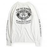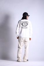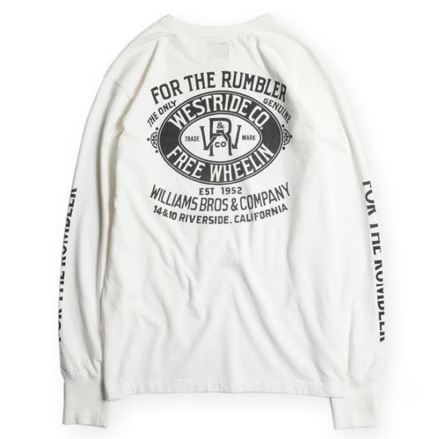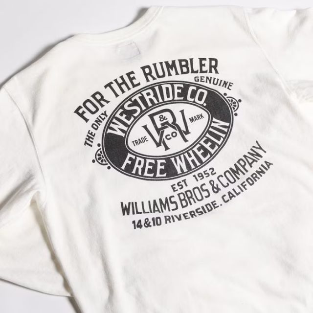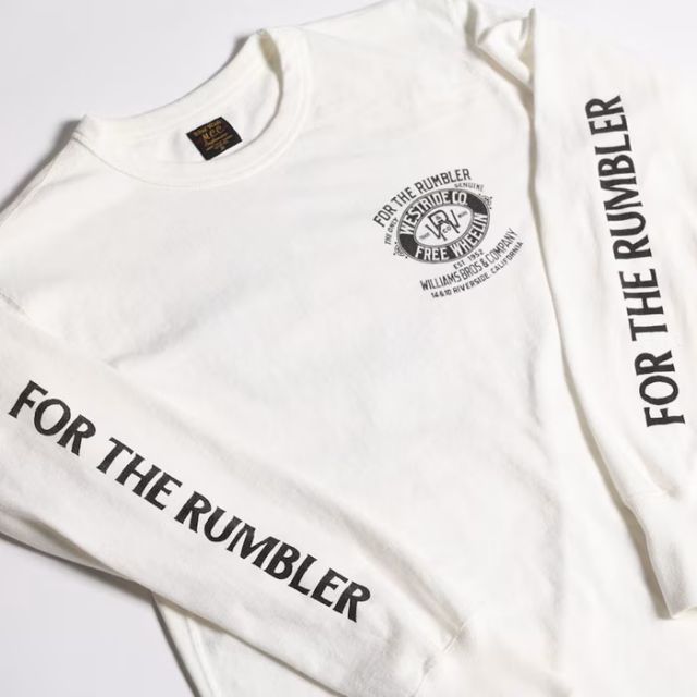 旧くは「4輪の馬車=音を立てて前に進むもの」を意味するRUMBLERSのワード。そんな人々の為の当時の衣料メーカーの旧き良きアドバタイズ風イメージでまとめ上げた今季の新作メイングラフィック。WILLIAMS BROSの名前でシーズンテーマに繋がる「JAMBALAYA」のカントリー・シンガーと自由への「解放」を表現。レイヤードで映える袖プリント入り。