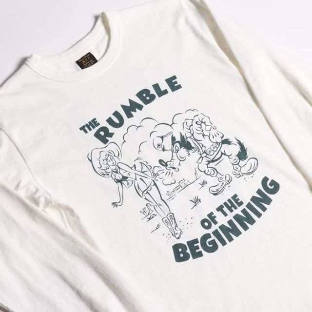 風を吹き付けるウルフとカウガール。当時から現在まで続く、2国間の相対的関係性をカートゥーン調のグラフィックでPOP且つシニカルに描いた注目の新作。漫画の原点である社会風刺的なニュアンスも持つアメカジ感がユニーク且つ新鮮に。バックプリントには自分の足で前に向かって歩を進めるタフなカウガールが。